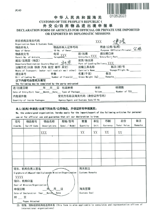 中華人民共和國海關外交公自用物品進出境申報單(樣例)