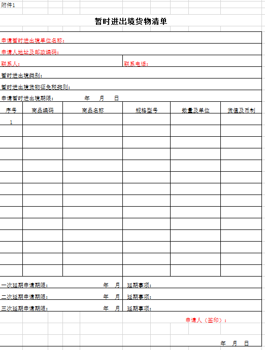 押保貨物暫時(shí)進(jìn)出境貨物清單(模板)