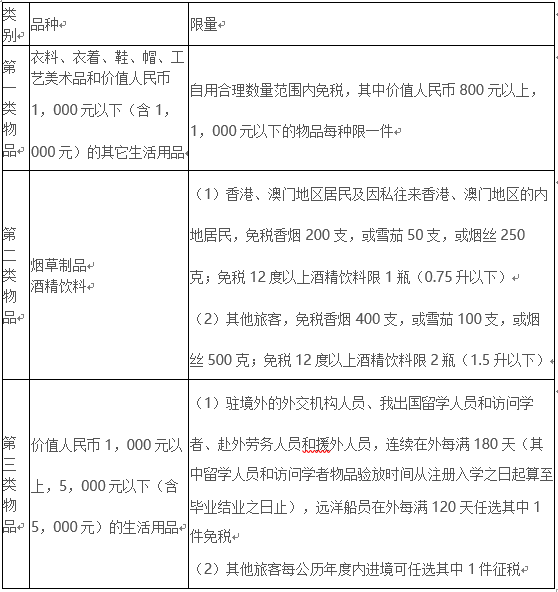 中國(guó)籍旅客帶進(jìn)物品限量表