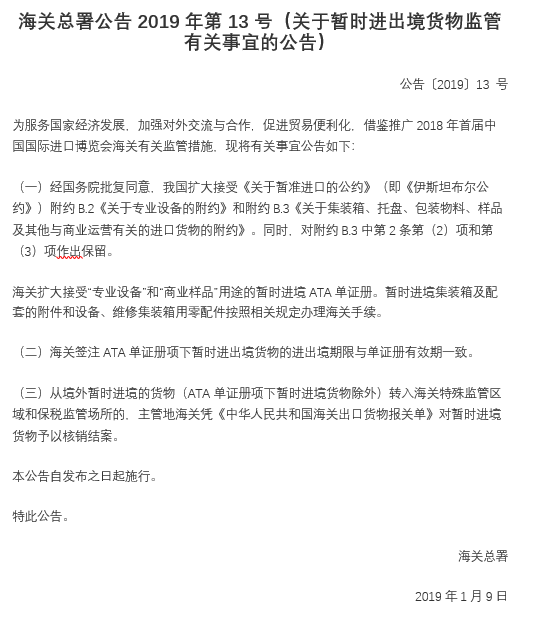 海關總署公告2019年第13號(關于暫時進出境貨物監(jiān)管有關事宜的公告)