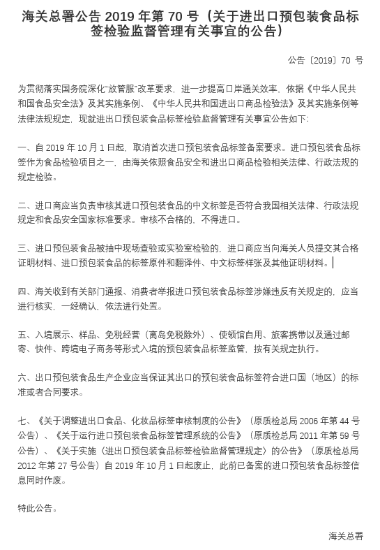 海關總署公告2019年第70號(關于進出口預包裝食品標簽檢驗監(jiān)督管理有關事宜的公告)