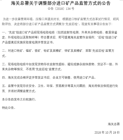 海關(guān)總署關(guān)于調(diào)整部分進(jìn)口礦產(chǎn)品監(jiān)管方式的公告