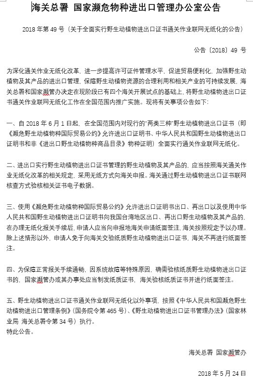 海關(guān)總署國家瀕危物種進(jìn)出口管理辦公室公告2018年第49號(關(guān)于全面實(shí)行野生動植物進(jìn)出口證書通關(guān)作業(yè)聯(lián)網(wǎng)無紙化的公告)
