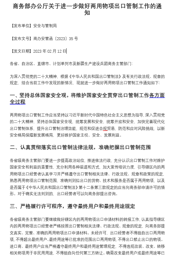 商務(wù)部辦公廳關(guān)于進一步做好兩用物項出口管制工作的通知