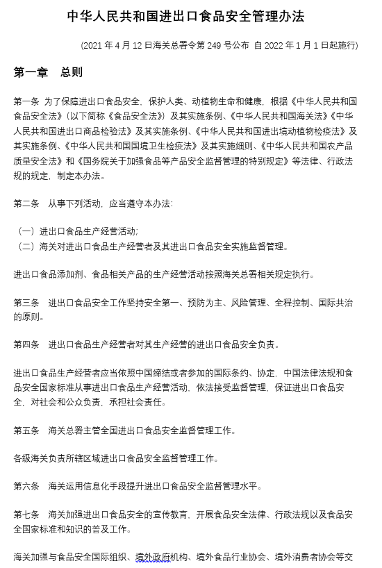 中華人民共和國(guó)進(jìn)出口食品安全管理辦法