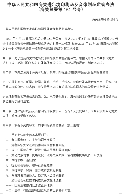 中華人民共和國海關進出境印刷品及音像制品監(jiān)管辦法(海關總署第161號令)