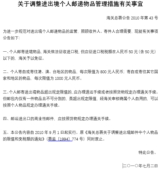 關(guān)于調(diào)整進出境個人郵遞物品管理措施有關(guān)事宜