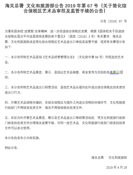 海關(guān)總署 文化和旅游部公告2019年第67號(關(guān)于簡化綜合保稅區(qū)藝術(shù)品審批及監(jiān)管手續(xù)的公告)