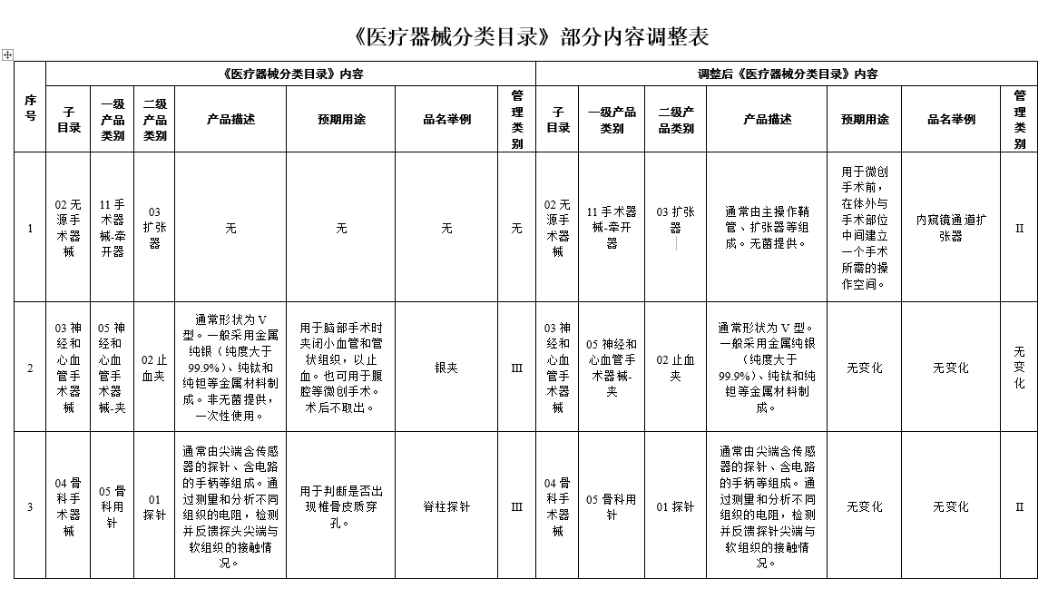 醫(yī)療器械分類目錄-部分內容調整表